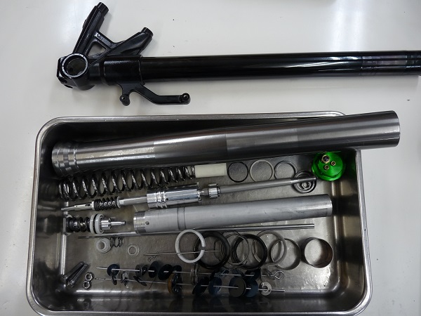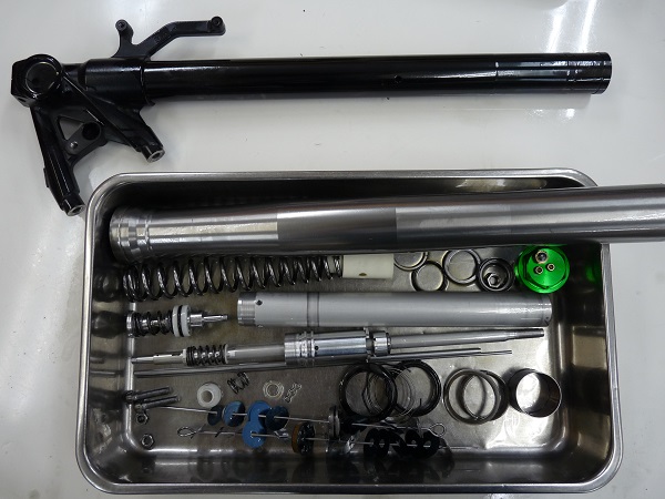 今回はフロントフォークをMEダンピングチューニング+1.00kgf/mのMEスーパースポーツスプリングによってセットアップいたしました。このH2のノーマルフロントフォークは全体的に動き過ぎる感があり、特にコンプレッション側の低、中速域のダンピングを高めに設定して落ち着きのあるしっかりとしたフロントフォークに仕上げることができました。