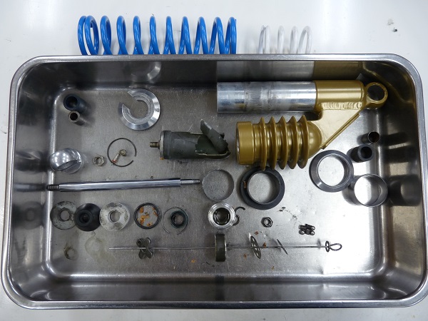 こちらのお客さまからはフルメンテナンスに加えて、ショックボディ(ゴールド部分)とスプリング(水色&白色)をパウダーコーティングによって再塗装して組み上げました。