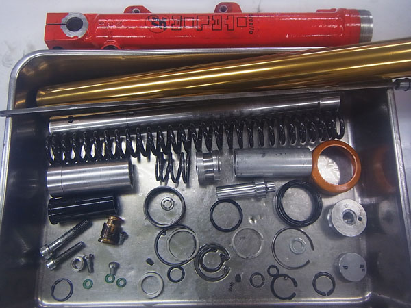 今回、フロントフォークのセットアップをご依頼いただいたお客さまは、以前にリヤショックのMEダンピングチューニングをご依頼いただいており、その結果を高く評価していただいて、今回、フロントフォークのMEダンピングチューニング+MEスーパースポーツスプリングでのセットアップをご依頼いただきました。