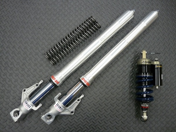 SHOWA製インナーパイプ径φ43倒立フロントフォークと、PENSKE RACING SHOCKS 8987piggybackです。