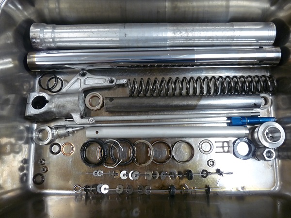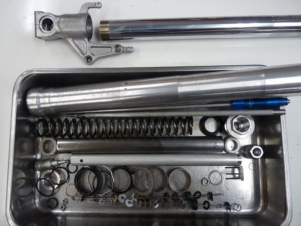 今回は錆びで痛んでしまったフロントフォーク・インナーパイプをクロームメッキの再メッキ加工で再生して、MEダンピングチューニングと0.95kgf/mのMEスーパースポーツスプリングでセットアップ。(ノーマルのスプリングレートは、1.00kgf/m)