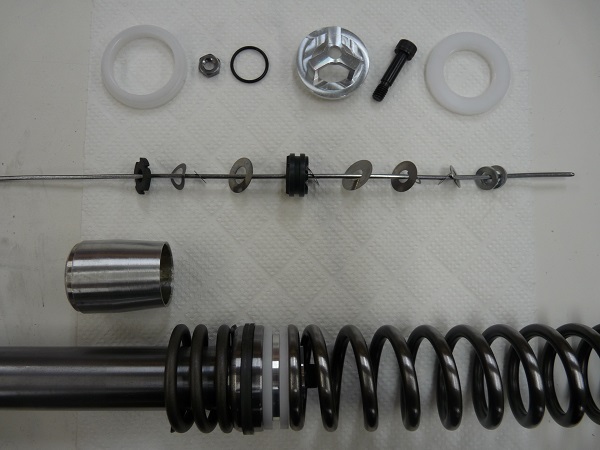 こちらが「コントロールバルブ」のパーツです。「フリーピストンタイプ」のフロントフォークでもこれらのパーツの組み合わせによって、サスペンションオイルの流路をコントロールすることで適切なダンピングフォースを発生させます。「コントロールバルブ」のキモとなるメインバルブは、「カートリッジタイプ」に使われる「積層式」のバルブを採用することで、サスペンションストロークスピードの低速域のダンピングをなめらかに発生させています。