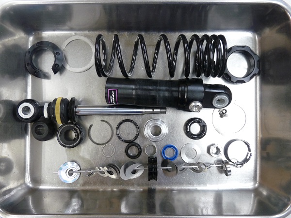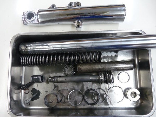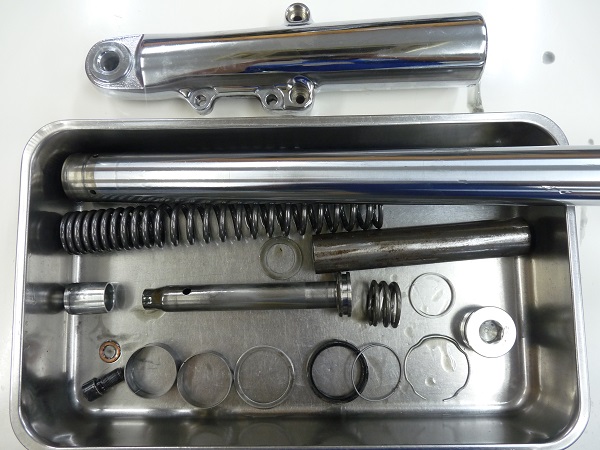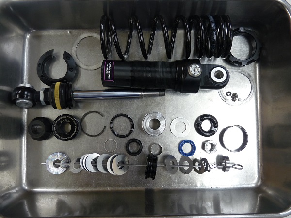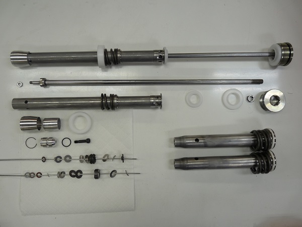 上側2つのダンパーカートリッジと、左下のピストン+多数のバルブシムがスクーデリアオクムラオリジナルの「MEインナーキット」。これに「MEスーパースポーツスプリング」がセットとなります。このパーツ構成は、スーパースポーツモデルと全く同じ。ハーレーダビッドソンFLTRUSEと乗られるオーナーさまに合わせたダンピング仕様とスプリングレートでセットアップします。