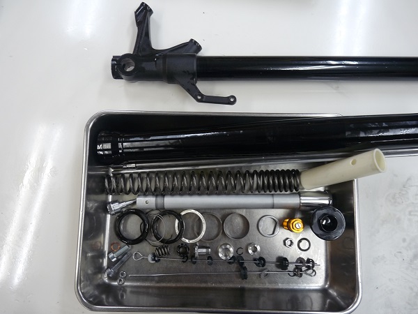 MT-09、XSR900用として、Y’Sギヤからリリースされたリ・プレイスサスペンションを前後に装着されたお客さまから「サスペンションのゴツゴツ感、突き上げ感が直らない。何とかならないものか?」とご相談を受けました。その対策とさらなるハンドリングの向上、接地感の向上を目的に、前後サスペンションのMEダンピングチューニングをご提案させていただいたところ、フロントフォークにMEダンピングチューニング+MEスーパースポーツスプリング(0.85kgf/m)でのセットアップと、リヤショックは新にPENSKE RACING SHOCKS8987リモートタイプをご購入いただけることになりました。