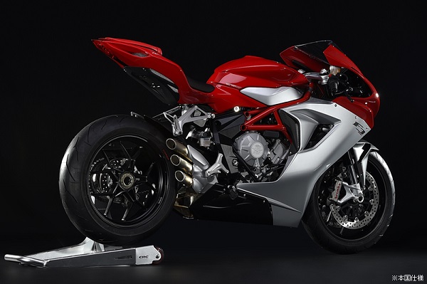 スーパースポーツ世界選手権のホモロゲーションモデルF3 675のボアをそのままにストロークアップした798cc水冷並列3気筒DOHC12バルブのエンジンは、148ps/13,000rpmを発揮します。レースレギュレーションの縛りから脱したエンジンは扱いやすさに重点が置かれています。モトGPマシンに採用されている逆回転クランクの採用もこのモデルの特徴で、ジャイロ効果による安定性よりもクイックなハンドリングを求めての設計がなされています。