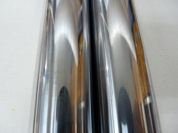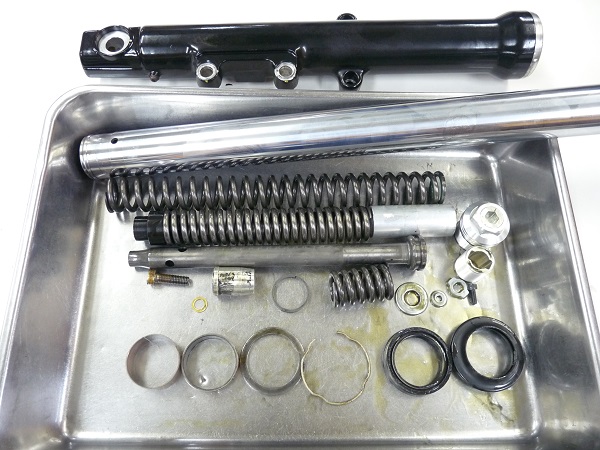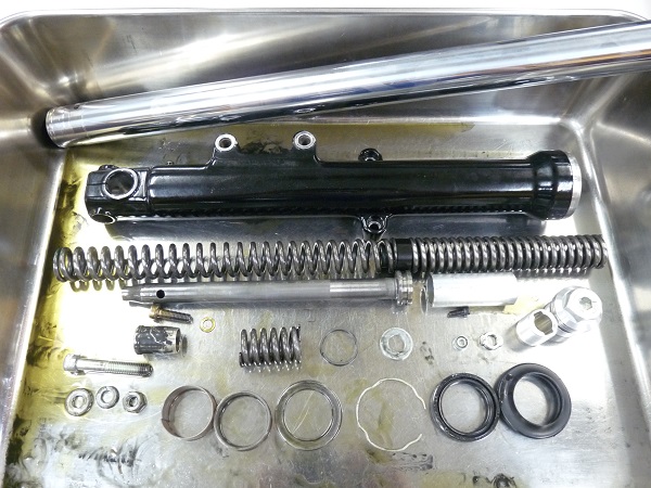 ハーレーダビッドソンFXDのハンドリングと乗り心地にご不満を感じられていたお客さまが、リ・プレイス品のFXD用フロントフォークスプリングを組み込んだものの、ハンドリング、乗り心地共に改善することはなく、却ってフロントが入り過ぎるようになってしまったとのことで、スクーデリアオクムラにご相談にいらっしゃいました。そこでスクーデリアオクムラのオリジナルの「コントロールバルブ」を組み込む方法のMEダンピングチューニング+0.80kgf/mのMEスーパースポーツスプリングでセットアップをお勧めして、ご理解、ご納得いただいてフロントフォークをチューニング。お納めした後にもお店にお越し下さり「とても良くなった」と喜んでいただきました。インナーパイプに曲がりがありましたので、曲がりの修正加工とクロームメッキの再メッキ加工によって再生して組み上げています。輸入車のインナーパイプはとても高価ですし、新品のパーツより品質の高いクロームメッキによる再メッキ加工はとてもお勧めです。