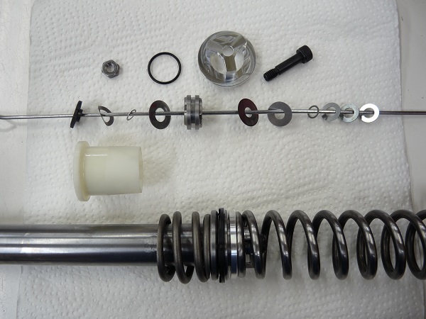 TMAXのフロントフォークのMEダンピングチューニングには、スクーデリアオクムラオリジナルの「コントロールバルブ」を組み込みます。ノーマルの「フリーピストンタイプ」のフロントフォークに、積層式のピストンとバルシムを専用のホルダーを使って組み込むことでフォークオイルの流路を最適な状態にコントロールすることができます。