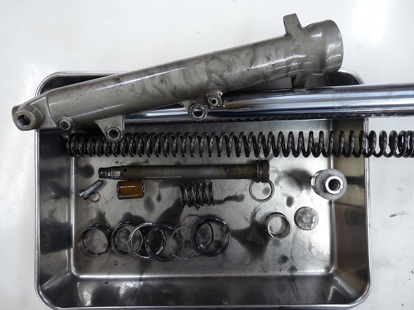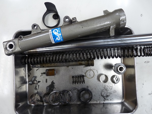 こちらがスクーデリアオクムラオリジナルの「コントロールバルブ」を組み込んでのMEダンピングチューニングのチューニングパーツです。シンプルがゆえに初期減衰が不安定なフリーピストンタイプ構造のノーマルフロントフォークに積層式のバルブを組み込むことで初期作動から常用作動域までの減衰(ダンピング)を生み出しています。オイルロックピースに手を加えることで実有効ストロークを増やしています。