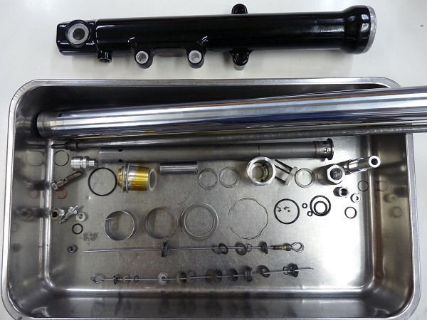 FXDX2001年モデルには調整機構こそ備わっていませんが、カートリッジタイプのフロントフォークが純正装着されています。とは言ってもノーマルはとてもソフトな乗り味で、ダンピング仕様、スプリングレート共に不足気味。ノーマルのままではワインディングロードを気持ち良く走るには頼りなさを感じてしまいます。スクーデリアオクムラではこのダンパーカートリッジを分解して、フォークオイルがスムースに流れるようにメインピストンに手加工によって改良を加え、バルブシムの径や厚み、枚数を変更し、シングルレート0.80kgf/mのMEスーパースポーツスプリングで組み上げるチューニングを施します。これがMEダンピングチューニング+MEスーパースポーツスプリングでのセットアップです。R側インナーパイプに0.60mmの曲がりがありましたので、修正して再メッキ加工、L側インナーパイプは曲がりは無いものの、錆が進行しておりましたので再メッキ加工を施して左右共に再生して組み上げています。