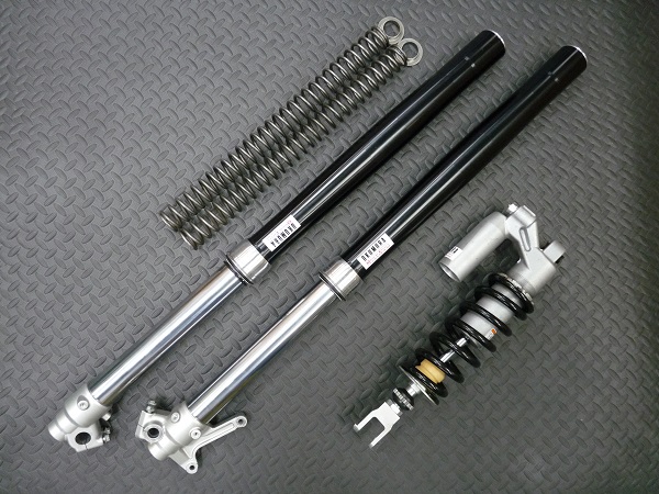 KYB製インナーパイプ径Φ46倒立フロントフォークと、SOQI製モノリヤショックです。