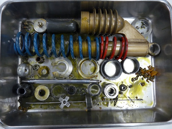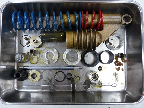 KZ1000は、エディ・ローソンのライディングによって、アメリカAMAスーパーバイク選手権において、1981年、1982年と2年連続でチャンピンを獲得しています。1981年のシーズン後にプライベートチームに向けたホモロゲーションモデルとしてKZ1000Sが30台のみ製作されました。「エディ・ローソン・レプリカ」と呼ばれています。このマシンに採用されていたリヤショックがアメリカ製の「ワークスパフォーマンス」であったことから、Z系のカスタムマシンの多くにこのリヤショックが装着されています。スクーデリアオクムラではこのリヤショックのフルメンテナンス、MEダンピングチューニング、ボディやスプリングのパウダーコティング(粉体塗装)のご依頼をたいへん多くご依頼いただいています。「ワークスパフォーマンス」純正のブラダと呼ばれるパーツは樹脂製で耐久性の乏しく、ほとんどが破れてしまっています。スクーデリアオクムラは日本製、ゴム製のパーツに交換することで、機能性、耐久性を高めています。今回もMEダンピングチューニングをメインに、各パーツへのパウダーコーティングによってレストアいたしました。
