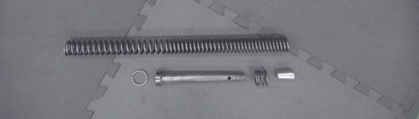 これがノーマルフロントフォーク(フリーピストンタイプ)の主要パーツ、スプリングとダンパーシリンダ、リバウンドスプリングとオイルロックピースです。