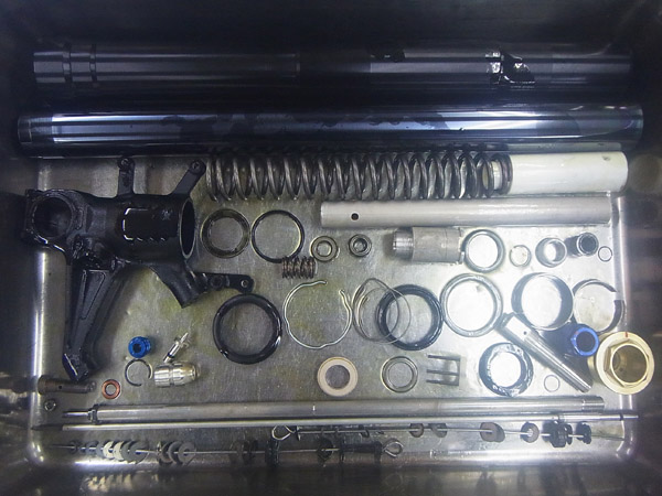 今回はフロントフォークのフルメンテナンスに加えて、インナーパイプへのMEチタンコーティング、アウターパイプへのMEブラックカシマコーティングを施し、フリクションロスの少ないフロントフォークに仕上げることができました。