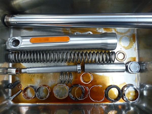 今回は2018モデルのHD FXLRのフロントフォークチューニングをご依頼いただきました。このチューニングシステムを使うことで、「フリーピストン」構造のフロントフォークを質感の高いダンピング特性にアップグレード。さらにスプリングレート0.70kgf/mのMEスーパースポーツスプリングと、インナーパイプのMEチタンコーティング(ゴールド)を併せてセットアップが完了です。