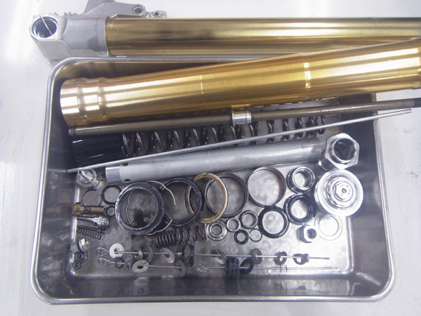 今回、このMV AGUSTA F4-1000 Tamburiniのサスペンションフルメンテナンスをお任せいただきました。特にリヤショックは特別な造りでコンプレッション(圧側)、リバウンド(伸び側)の両方にロースピードとハイスピードのダンピングを独立して調整できる機能が備わっています。