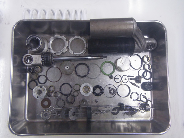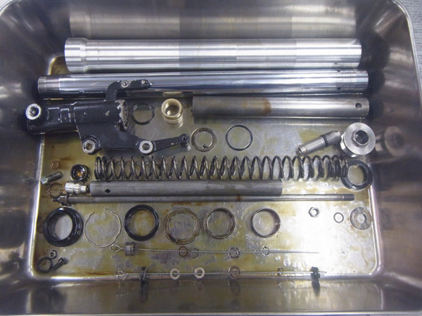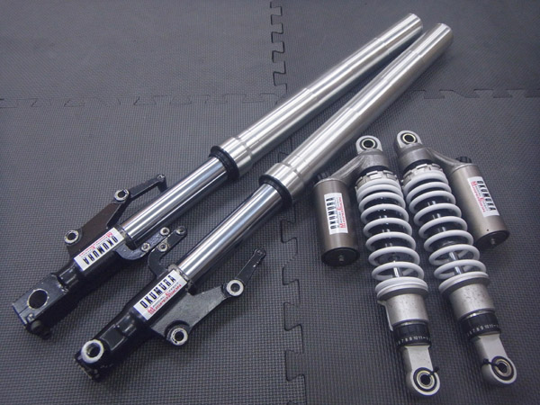 フロントフォーク インナーパイプは錆が進行しておりましたので再メッキ加工によって再生し、MEダンピングチューニング+MEスーパースポーツスプリングでセットアップしました。また、フォーク全長をSRに合わせるためのロング加工も行ないました。