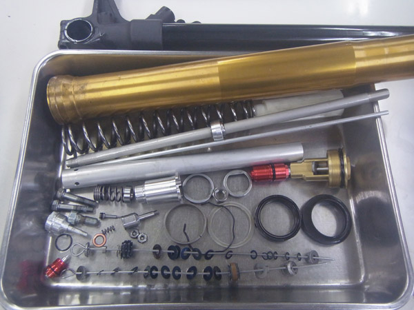 ハンドリングの向上を期待して前後サスペンションのMEダンピングチューニングのご依頼をいただきましたが、フロントフォークを分解してパーツをチェックしてみると、スズキ純正のDLCコーティングを施したインナーパイプに錆があり、研磨での修正範囲を超えていることが解りました。インナーパイプを新品のパーツに交換することになり、お客さまにとっては痛い出費となってしましました。