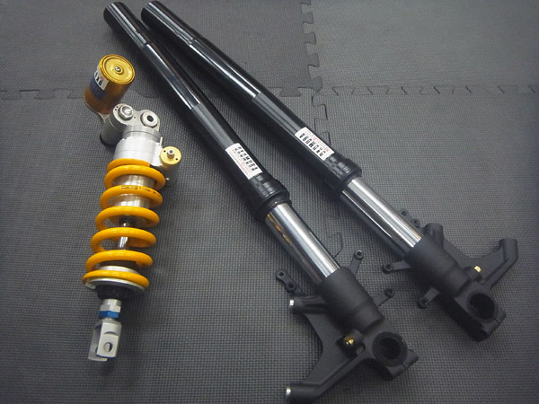 KYB製インナーパイプ径Φ43倒立フロントフォークとOHLINSリヤショックショックです。