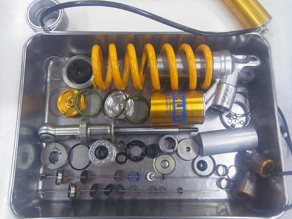 今回は前後のOHLINSサスペンションのフルメンテナンスをご依頼いただきました。いくら電子制御が進んだサスペンションでも基となるダンパー部分は従来通りのアナログなオイルダンパーです。サスペンションの源がしっかり機能していることで電子制御システムを有効に活用することができるのです。