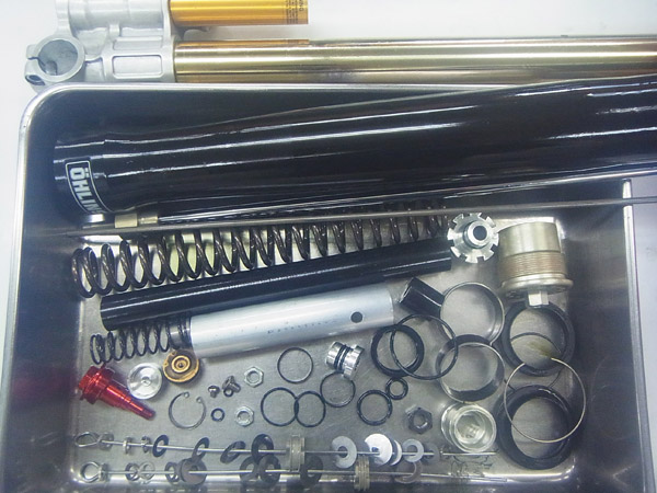 OHLINS製インナーパイプ径Φ43加圧タイプ倒立フロントフォークとOHLINS製モノショックです。