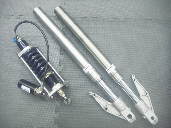 WP製インナーパイプ径Φ40倒立フロントフォークと PENSKE RACING SHOCKS8987type(5アジャスト)です。