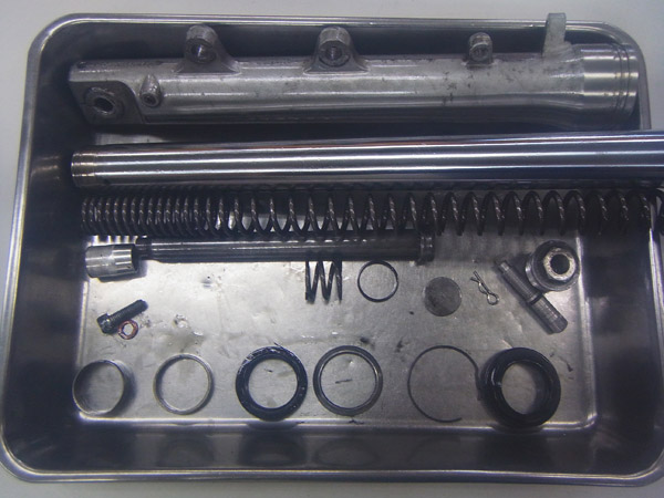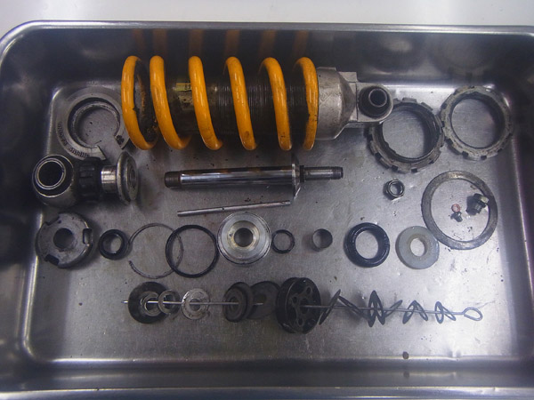 今回は純正フロントフォークとOHLINSリヤショックのフルメンテナンスをご依頼いただきました。