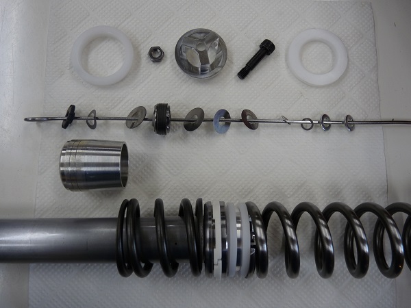 これがフロントフォーク内部のパーツ。スクーデリアオクムラのオリジナルの「コントロールバルブ」です。