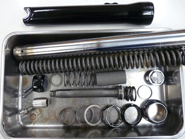 スクーデリアオクムラでは、ハーレーに採用されている「フリーピストンタイプ」のフロントフォークに積層式のバルブを組み込むスクーデリアオクムラオリジナルの「コントロールバルブ」によるセットアップと、フロントフォークの内部パーツをそっくり入れ替えて、スポーツモデルと同様の「カートリッジタイプ」に組み替える「MEインナーキット」でのセットアップの2種類のチューニングメニューをご用意しています。