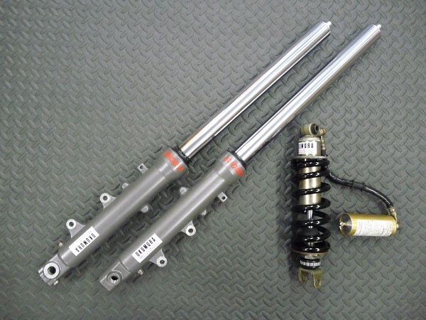SHOWA製インナーパイプ径φ41正立フロントフォークと、SOQI製リヤモノショックです。