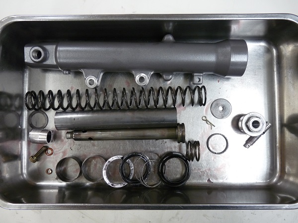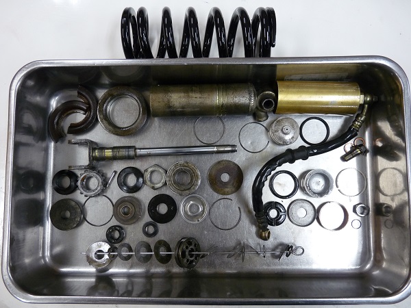 今回は前後サスペンションのフルメンテナンスに加えて、錆びでNGのインナーパイプの再メッキ加工、アウターパイプやリヤスプリングの粉体塗装など、レストア的なご依頼をいただきました。