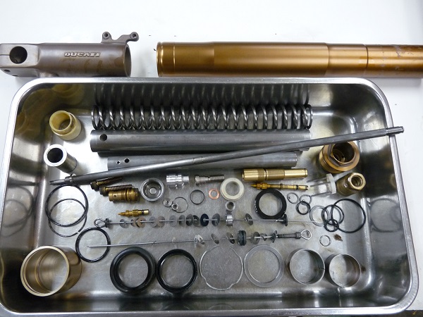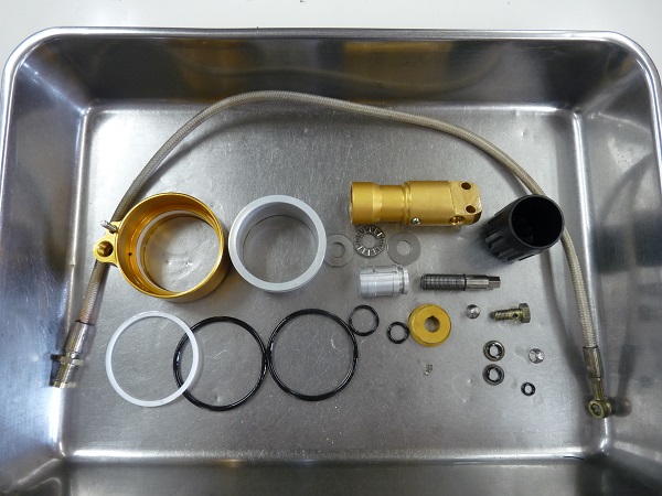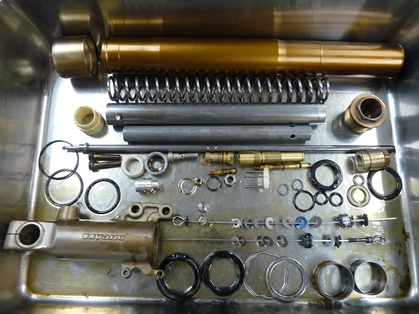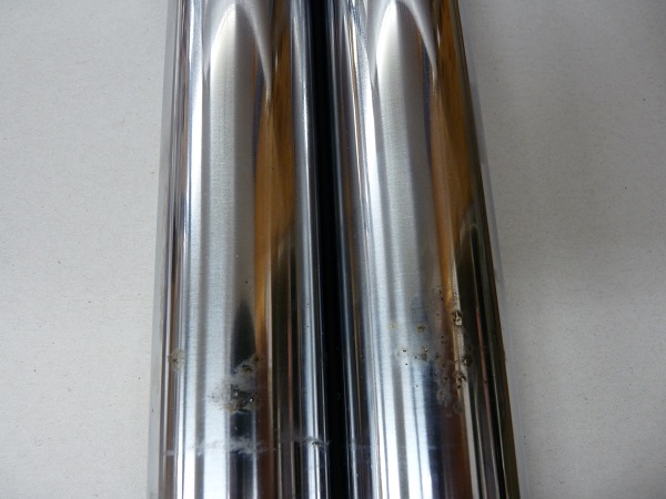 錆でコンディションの悪かったインナーパイプはクロームメッキの再メッキ加工によって再生しています。硬質クロームメッキによる再メッキ加工はノーマルの新品パーツを大きく上回るクオリティです。クローメッキの再メッキ加工を施した後にMEチタンコーティングを施工することになります。