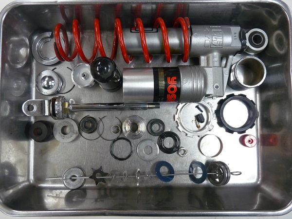 こちらが今回、フルメンテナンスを施したヨシムラKYBリヤショック。スクーデリアオクムラのフルメンテナンスによって新品時を上回るパフォーマンスとなります。6ヶ月間のオイル漏れ保証をお付けします。費用は税込み、左右ペアで¥40,392-。この中には基本交換パーツ、オイル、パーツ超音波洗浄/計測/研磨を含みます。