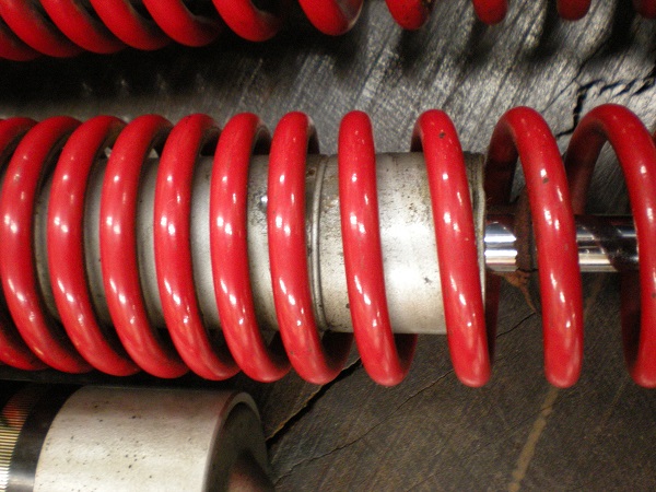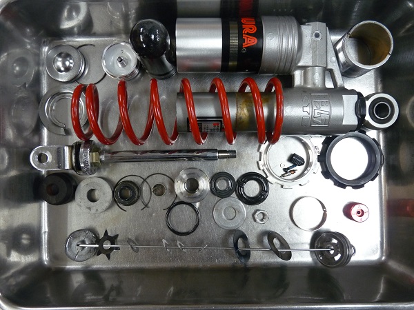 こちらが非分解の構造で、フルメンテナンス不可のヨシムラKYB。ショックボディにつなぎ合わせたような「カシメ」のラインが見えます。