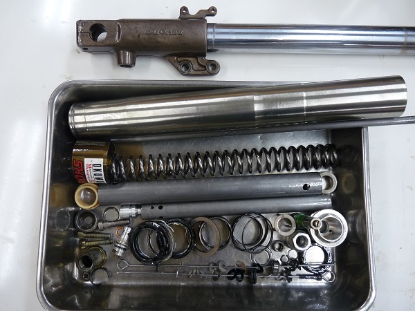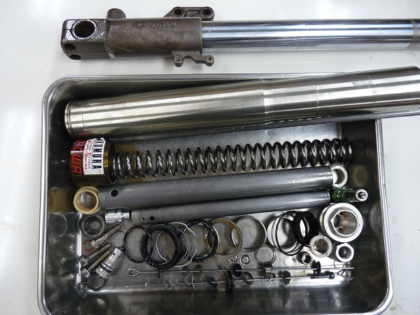 こちらのお客さまは2015年にフロントフォークにMEダンピングチューニング+MEスーパースポーツスプリングでのセットアップをご依頼いただいており、それから3年半が経過したということでフルメンテナンスのご依頼をいただきました。車両をお預かりしてサスペンションの脱着を併せてご依頼いただいく際は、サスペンションを車両に装着した状態での分解前の作動チェックを行ってからフルメンテナンスの作業に掛かります。フルメンテナンス完了後の作動チェックはもちろんのこと、車体にサスペンションを装着した後に必ず走行テストを行ってからお客さまにお納めします。お客さまに安心してお乗りいただくことを最優先に進めています。