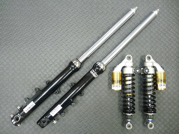 SHOWA製インナーパイプ径φ39正立フロントフォークと、OHLINS製ツインリヤショックです。