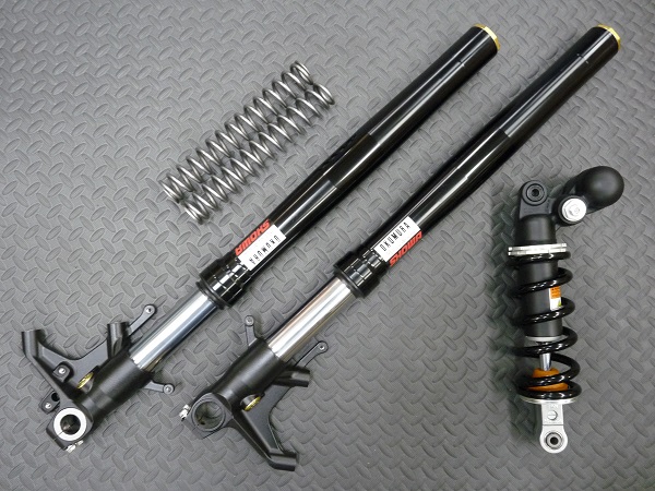 SHOWA製インナーパイプ径φ43BPF倒立フロントフォークと、SHOWA製モノリヤショックです。