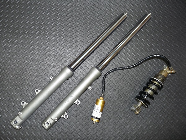 SOQI製インナーパイプ径φ38正立フロントフォークと、SOQI製モノリヤショックです。