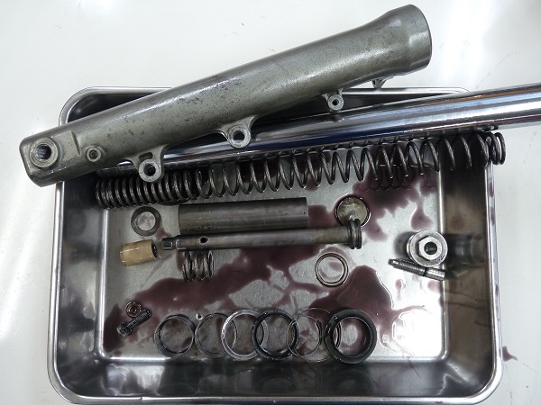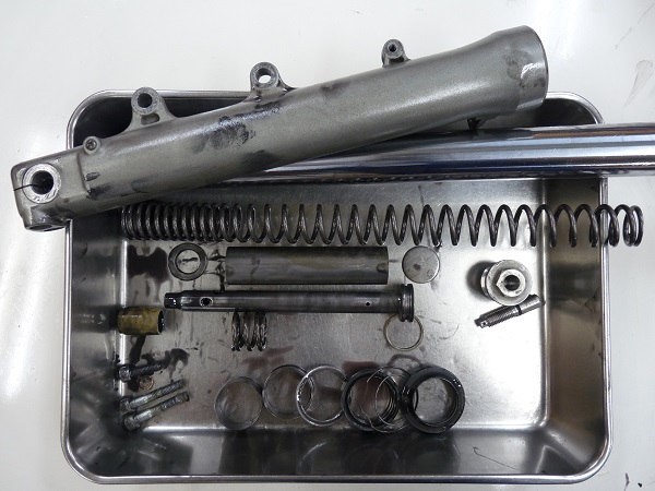 今回は前後サスペンションのフルメンテナンスをお任せいただきました。フロントフォークのフルメンテナンスは基本交換パーツ、オイル、分解パーツの超音波洗浄、計測、研磨を含めて¥29,040-(税別)。リヤショックは窒素ガスを注入するためのバルブの装着(¥2,650-)を含めて、フルメンテナンスの費用は¥31,910-(税別)となります。