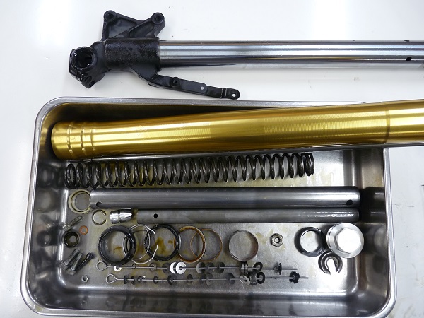 トライアンフ定評の水冷並列3気筒799ccエンジンは、95馬力/トルク79Nmのスペックを誇り、強靭なスチール製フレームとの組み合わせによって、本格的なデュアルパーパスマシンに仕上がっています。ロングストロークのサスペンションながら、ロード志向の設定で仕上げられており、余裕サイズのラゲッジやゆったりとしたライディングポジションによって「バイク旅」に夢の膨らむタイガー800です。今回は走行距離が3万キロに達したこともあり、フロントフォークのフルメンテナンスをお任せいただきました。