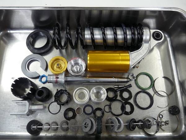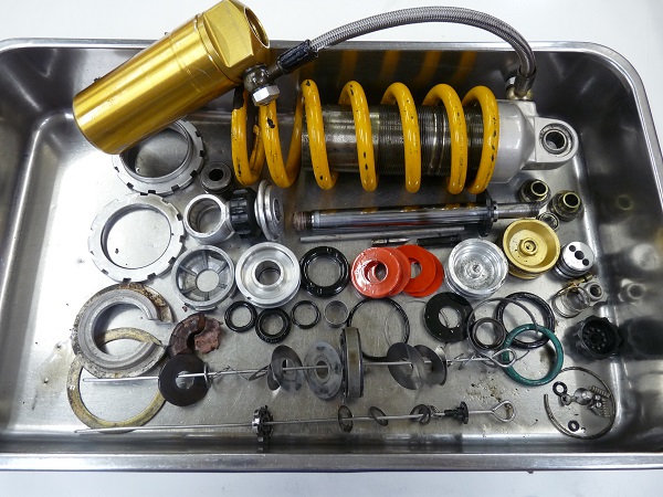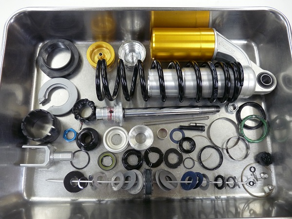 ここ最近に手掛けたOHLINSリヤショックのフルメンテナンスです。スクーデリアオクムラではノーマルサスペンション以外でもPENSKE RACING SHOCKSを始め、OHLINSやHYPERPRO、WPなどのリ・プレイスサスペンションのフルメンテナンスやMEダンピングチューニングなど、ほとんどのブランドのサスペンションに対応しております。また、リ・プレイスリヤショックとのバランスを整えるための、フロントフォークのMEダンピングチューニングもたいへん多くご依頼いただいております。是非、ご相談下さい。