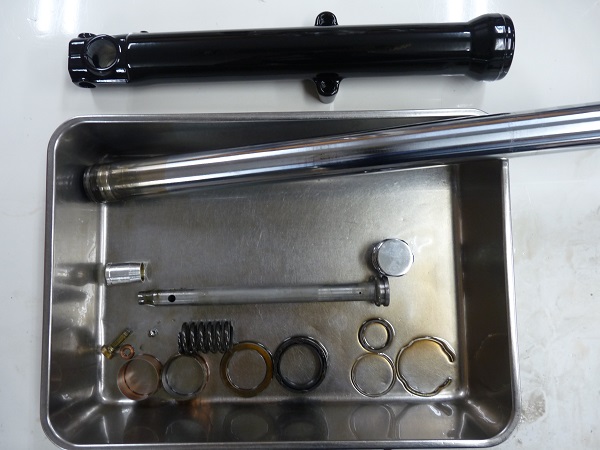 こちらがスクーデリアオクムラオリジナルの「コントロールバルブ」のパーツ全容です。シンプルなノーマルフロントフォークに新たに積層式のバルブを組み込んで、フロントフォークオイルの流路をコントロールします。MEスーパースポーツスプリングも併せてセットアップしました。