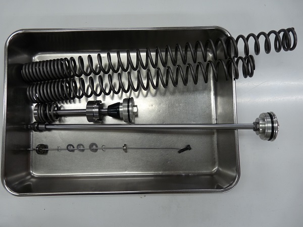 こちらが「MEインナーキット」の構成パーツです。ダンピング特性の変更によって、バイクのサスペンションにとても重要なサスペンションストロークスピードの極低速域のダンピングを安定的に生み出す仕様に設定、ギャップ吸収時に反応する高速域のダンピングを抑える設定にすることによって、接地感がつかみやすく、質感の高いサスペンションに仕上げることができます。スプリングレート0.80kgf/mのMEスーパースポーツスプリングを採用しました。