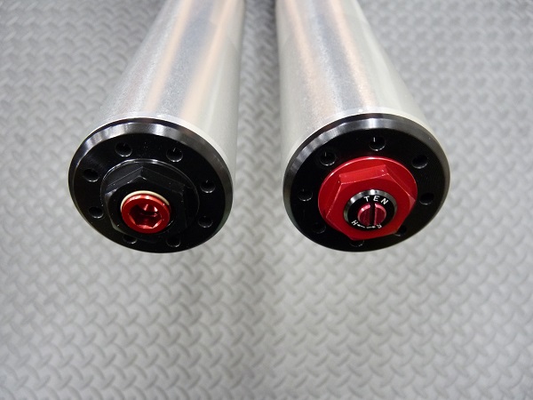 こちらが「MEインナーキット」のフォークキャップ部分です。左側はスプリングイニシャルの調整、右側に伸び側ダンピングとスプリングイニシャルの調整機構が備わります。レッドとブラックのカラーで仕上げました。