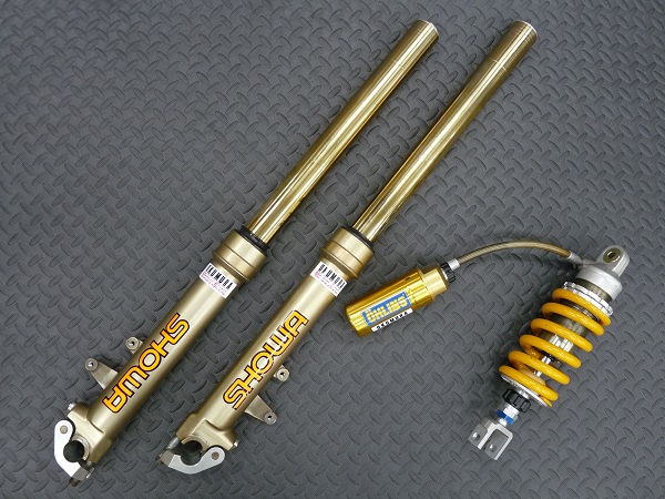 SHOWA製インナーパイプ径φ43正立フロントフォークと、OHLINS製モノリヤショックです。