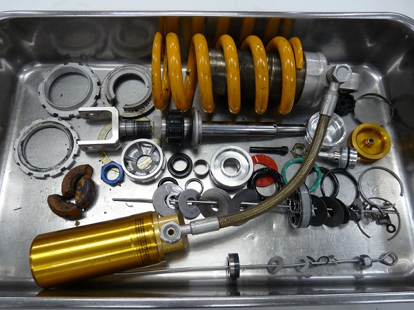 以前にこのVFR750R(RC30)のフロントフォーク・インナーパイプへのMEチタンコーティング、アウターパイプへのMEカシマコーティングと共に、MEダンピングチューニング+スプリングレート0.85kgf/mでのセットアップ、リヤに装着されていたOHLINSサスペンションのフルメンテナンスをご依頼いただいたお客さまより、約4年の時を経て前後サスペンションのフルメンテナンスをご依頼いただきました。今回はリヤにOHLINSを装着されていますが、SHOWA製ノーマルリヤショックでも問題なくフルメンテナンスやMEダンピングチューニングを施すことができます。サスペンションに関してはスクーデリアオクムラにご相談下さい。