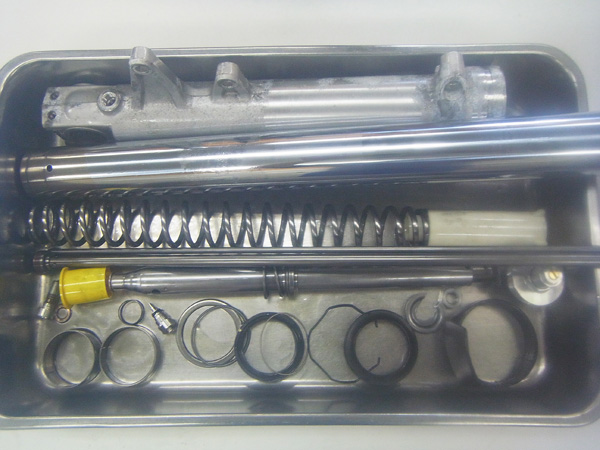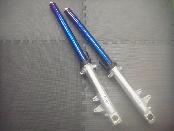 今回はフロントフォークのインナーパイプへのブルーレインボーのチタンコーティングをご依頼いただきました。