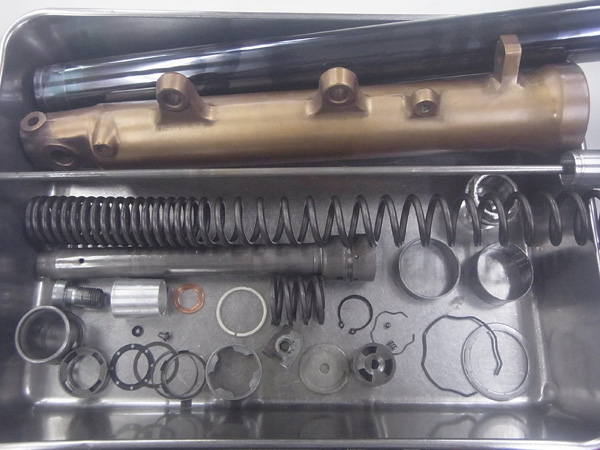 まずは、フリーピストンタイプのフロントフォークの内部パーツを全て入れ替えて、スクーデリアオクムラオリジナルのダンパーカートリッジタイプに組み換えます。これによって、初期作動からじっくりとダンピングの効いた質感の高いフロントフォークの動きを生み出すことができます。このキットの装着によって、伸び側ダンピングの調整とスプリングイニシャルの調整も可能となります。